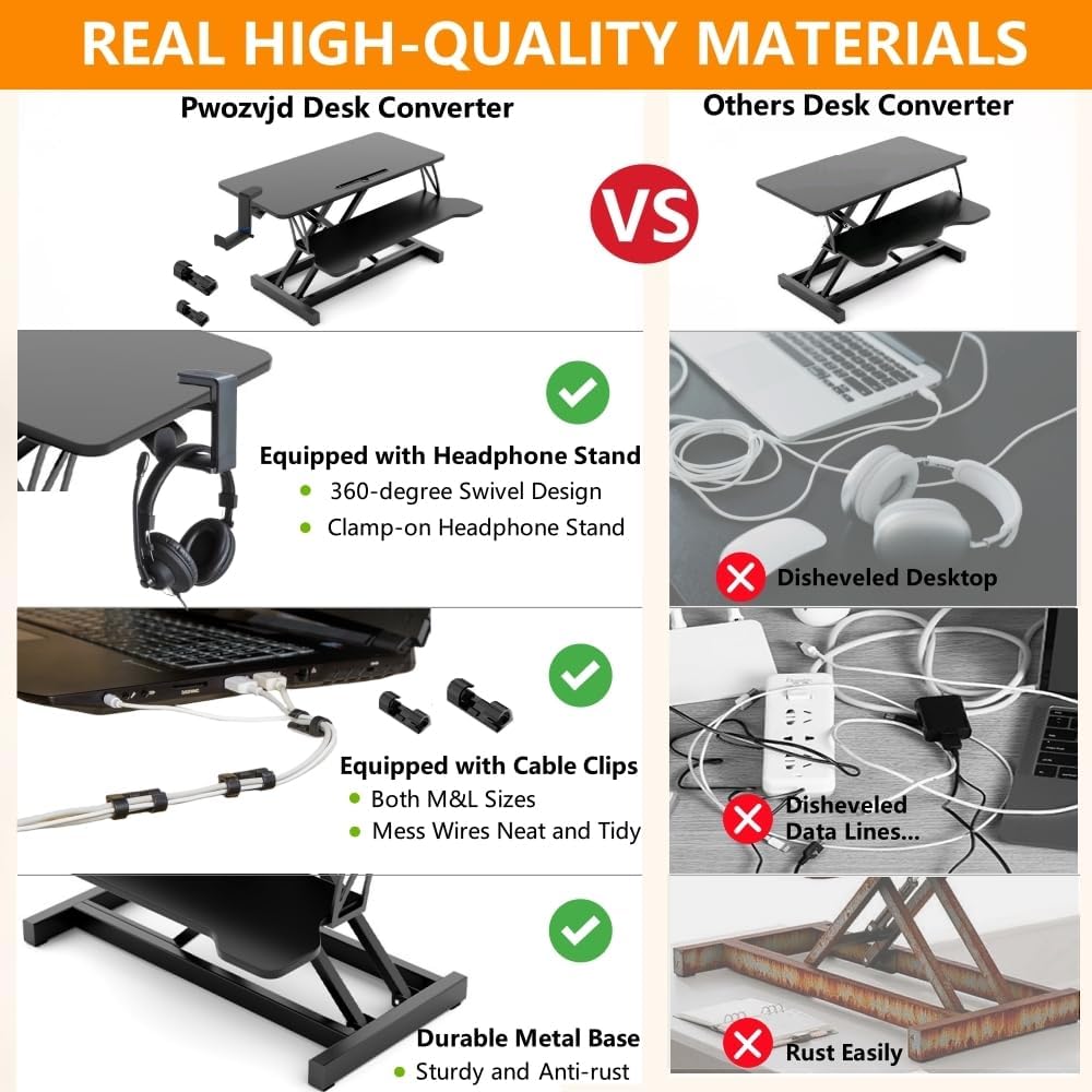 • Equipped with Cable Clips:The standing desk converter is equipped with a pack of cable clips.Just stick the adhesive pads at the back of the cable clips to use.Self-adhesive cable clips are very convenient.Pwozvjd offer clips in M and L sizes.They are suitable for wire management of network cables, headphone cables, USB cables, keyboard cables, telephone cables, audio cables, various power cables.Clean the installation surface,stick them and press firmly for 30 seconds, use them after 24 hours for maximum adhesion.A great helper for desk riser workstation organization.