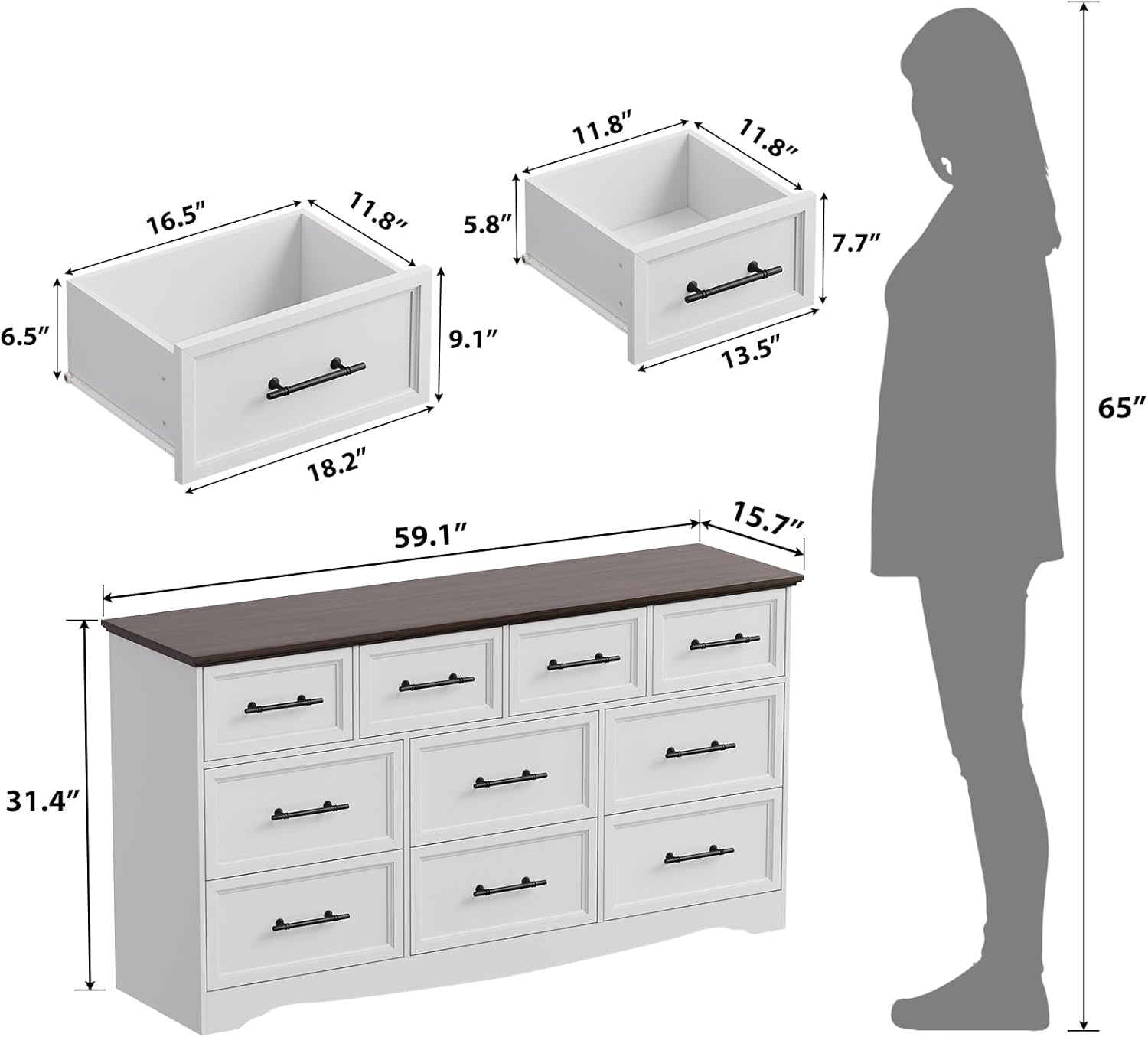 • 【Dimensions】The 10 drawers dresser dimension: 15.7"D x 59.1"W x 31.4"H. Whether in a modern loft or farmhouse setting, this chest of drawers fits right in. It presents a sophisticated interpretation of rustic charm, featuring subtle replicated wood grain with a natural finish for an authentic feel.