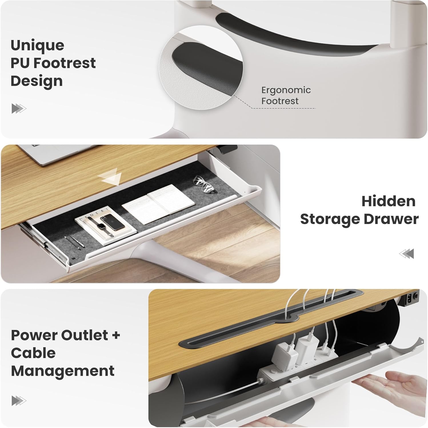 • Hidden Drawer & Organized Workspace: Unlike most standing desks, this one includes a large built-in drawer (25" wide) for easy storage of laptops, notebooks, and accessories. Combined with a rear cable tray + desktop grommet, it keeps your workstation clean, organized, and distraction-free.