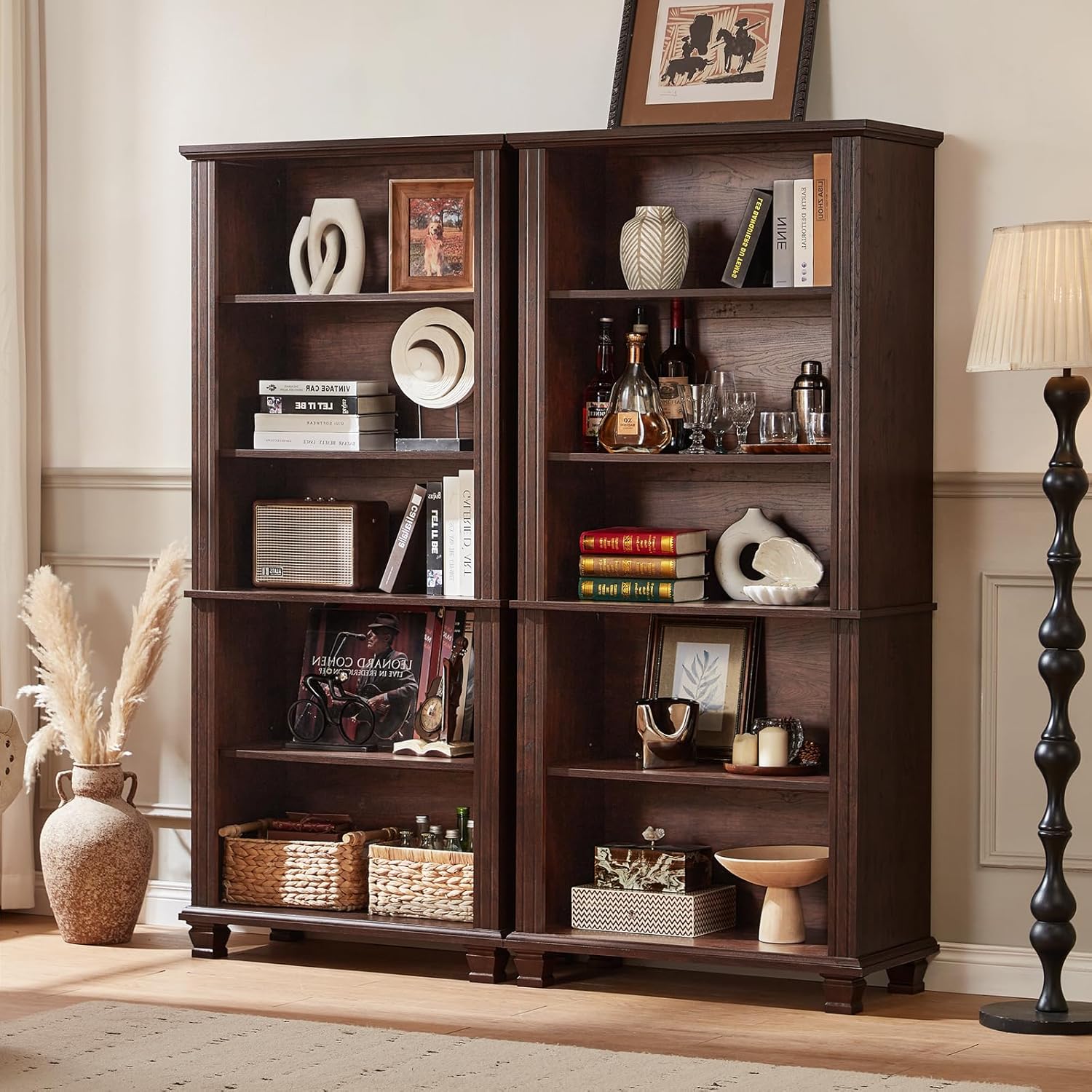 70" Tall Walnut Bookshelf,5 Tier Wooden Book Shelf with Adjustable Shelves & Wood Legs,Free Standing Farmhouse Bookcase with Open Display Storage,Vintage Bookshelves for Classroom, 2PCS