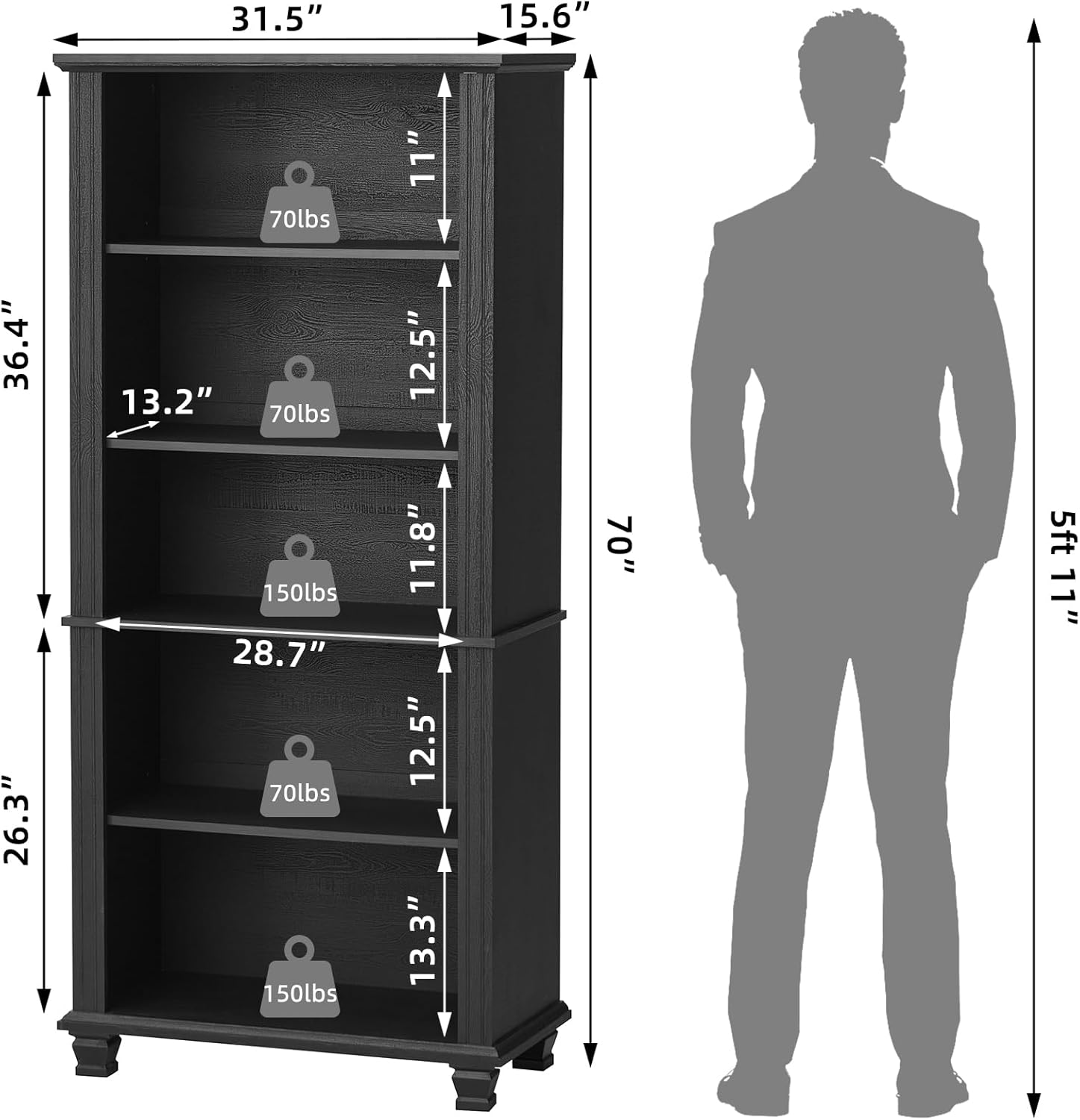 70" Tall Black Bookshelf,5 Tier Wooden Book Shelf with Adjustable Shelves & Wood Legs,Free Standing Farmhouse Bookcase with Open Display Storage,Vintage Bookshelves for Living Room, 3PCS