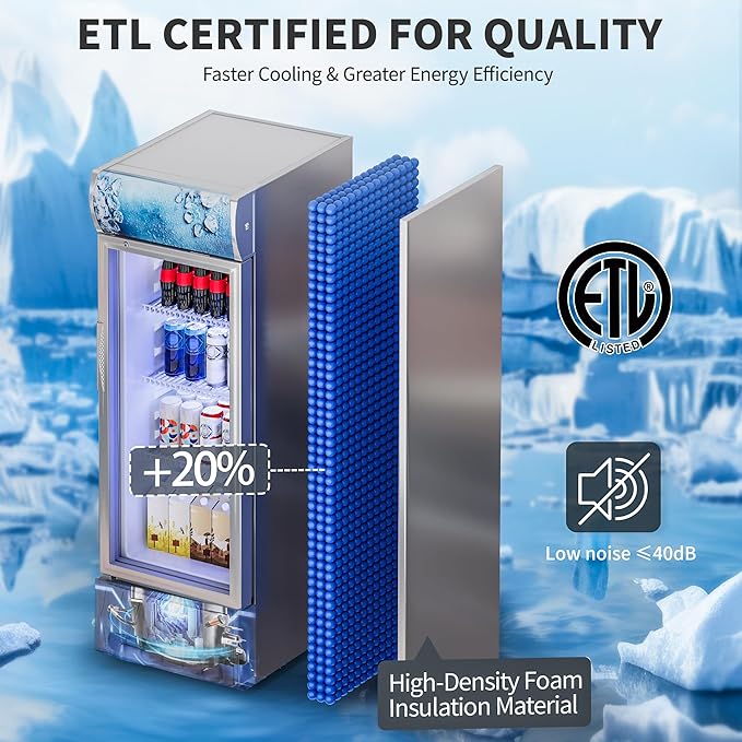 • Advanced Insulation & Visibility​​: Double-paned tempered glass in this ​​commercial fridge​​ blocks UV/heat. 20% thicker cyclopentane insulation ensures cool-air containment. Seamless design offers clear visibility as a ideal ​​display refrigerator with glass door