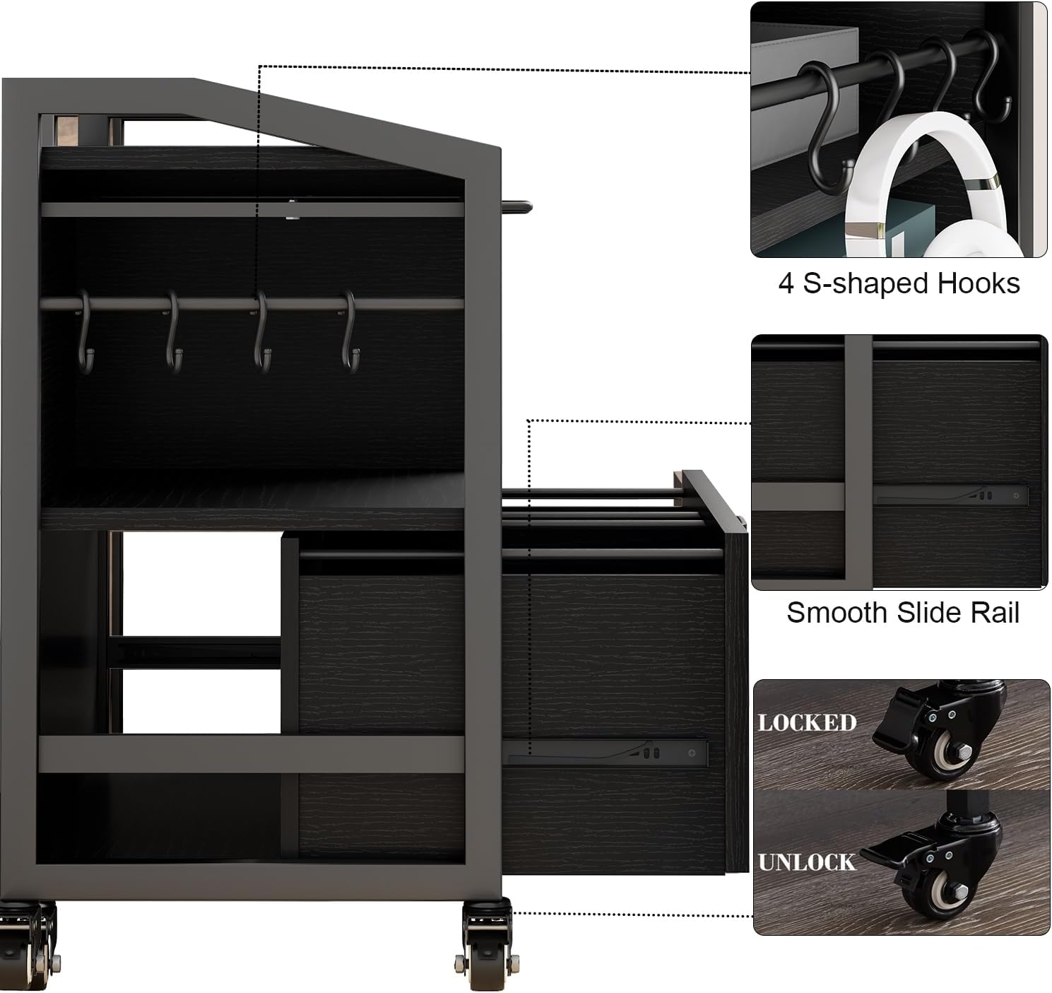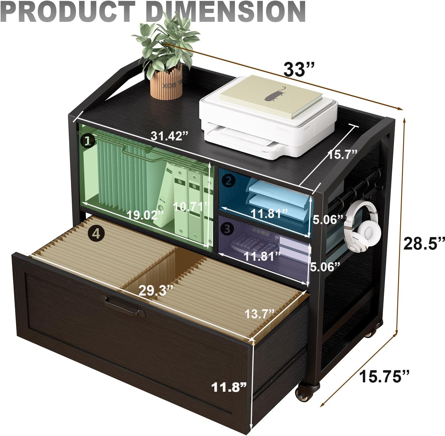 • All-in-One Storage Solution:Stay organized with 4 removable S-hooks for headphones, bags, or accessories. This filing cabinet organizer also features 2 open storage shelves for books, binders, or office essentials. The spacious 31.42”L × 15.7”W top surface holds printers, scanners, or décor, doubling as a printer stand with storage. With multiple compartments, it keeps documents and supplies neatly arranged for any home office filing cabinet setup.